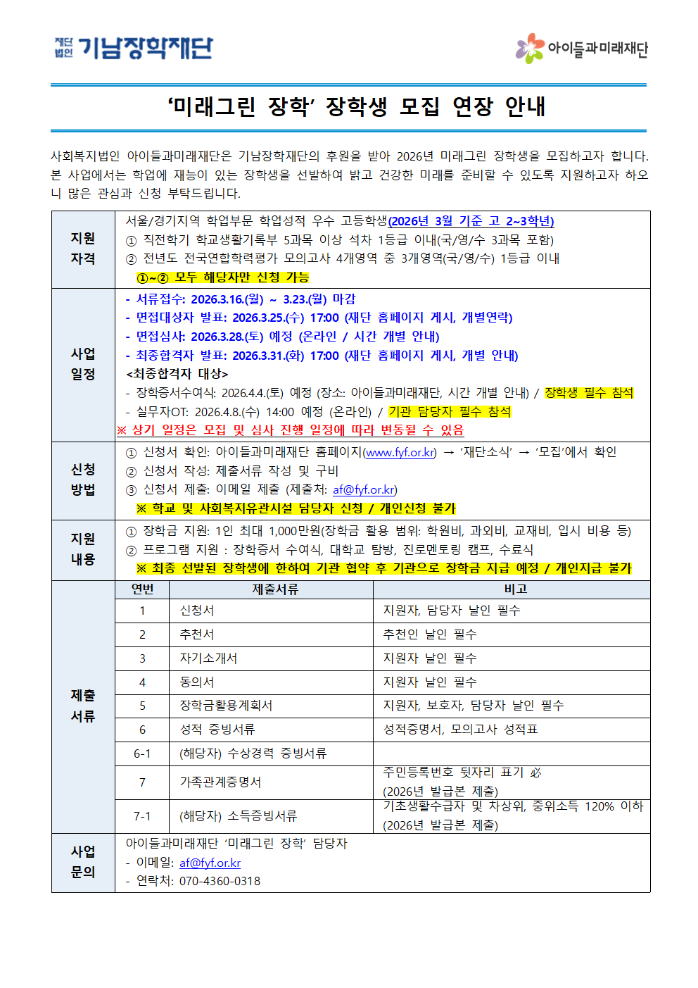 기남장학재단 미래그린 장학사업 3기 장학생 모집기간 연장 안내(~3/23)