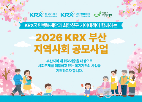부산 지역 내 취약계층을 대상으로 사회문제를 해결하고 있는 복지기관들을 지원하고자 '2026 KRX 부산 지역사회 공모사업'을 진행합니다.