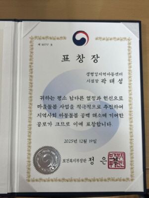 생명강지역아동센터 시설장님께서 보건복지부장관 표창장을 수여받으셨습니다.