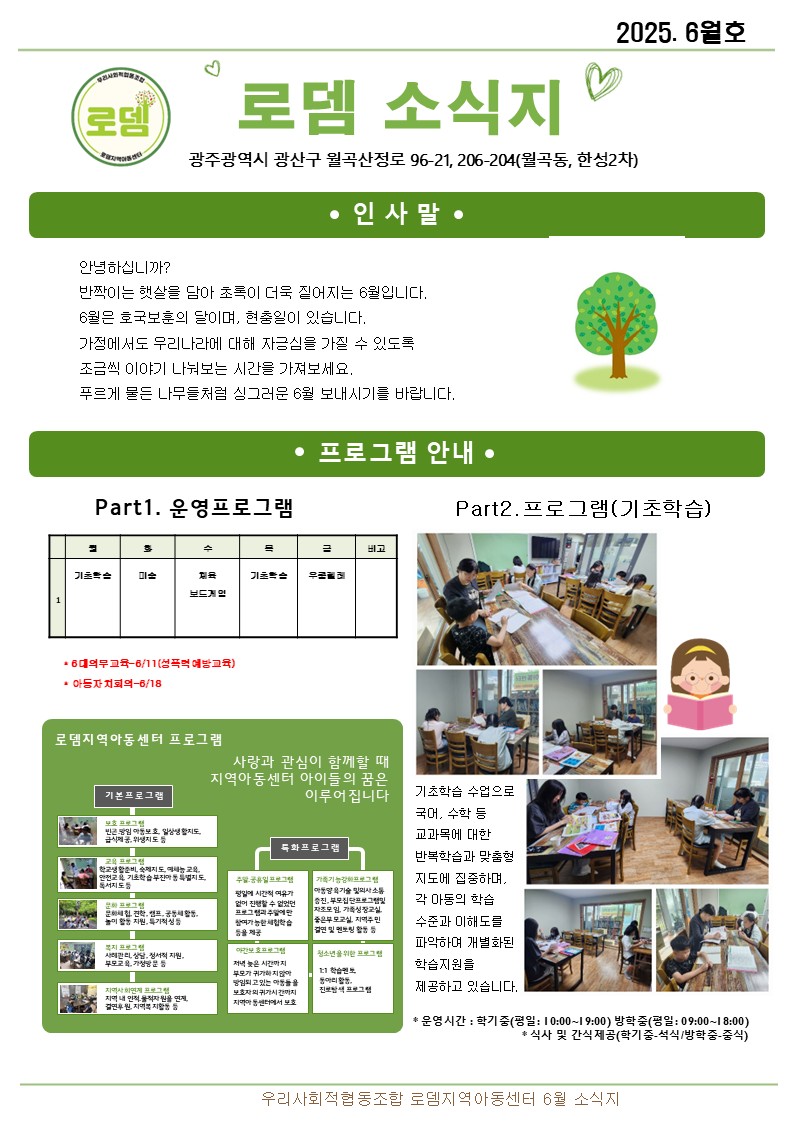 로뎀지역아동센터 | 광주광역시 광산구 월곡산정로 96-21, 206동 1층 204호 (월곡동, 한성 2차 아파트) [지도보기] Tel : 062-951-1439 Fax : 062-951-1435 E-mail : jayak@naver.com