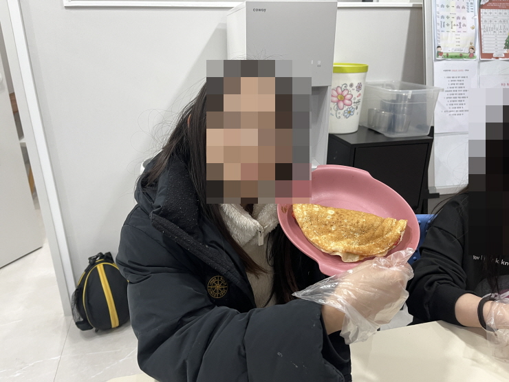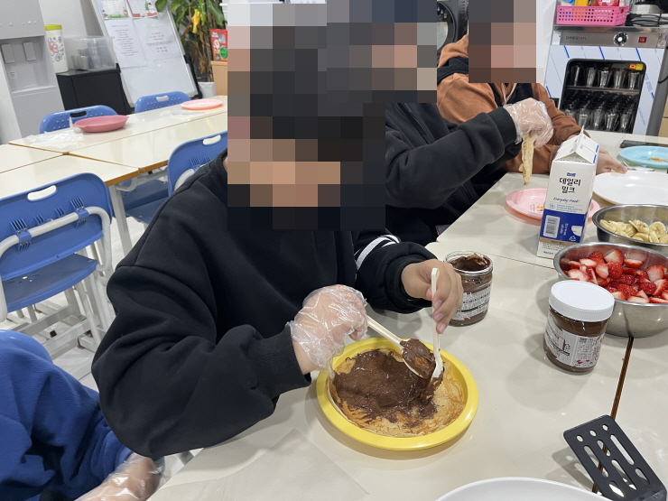 중학생 여자아이는 평소에도 꼼꼼한 성격을 보여 이번 요리활동에서도 꼼꼼한 성격을 장점으로 반죽을 얇게 펴 바르고 과일을 올려 함께 요리활동을 하는 친구들 사이에서 가장 완성도가 높은 크레페를 보여주었다. 3학년 여자아이도 세심하게 딸기와 바나나를 올려 아슬아슬하게 접어 크레페를 완성하였다.
