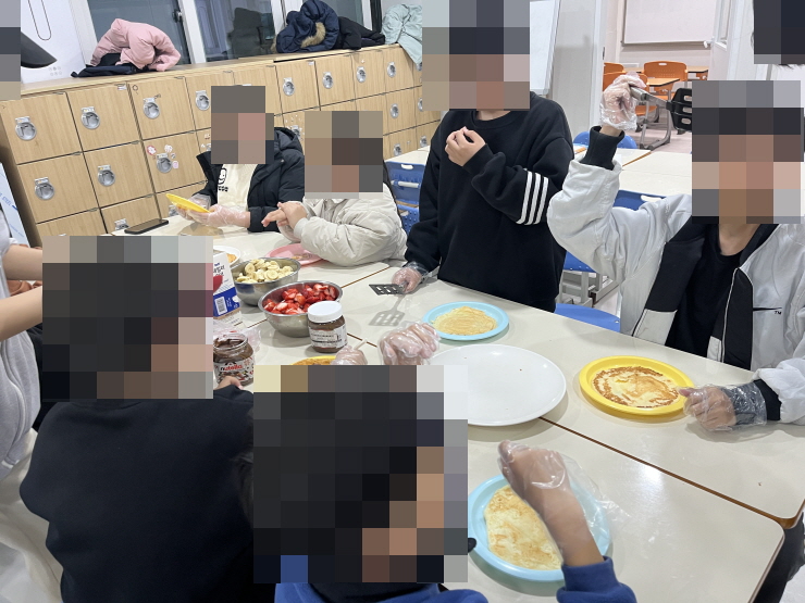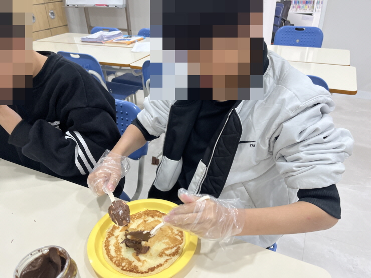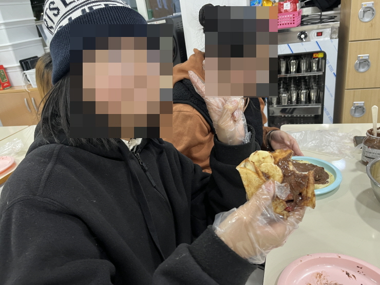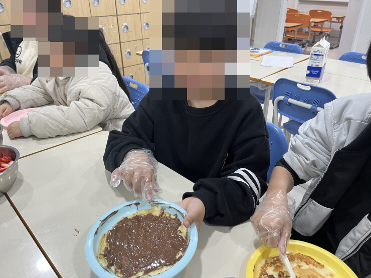 4학년 남자아이는 반죽에 누텔라를 다 바르고 과일을 넣지 않고 누텔라와 반죽만 하여 먹었다. 4학년 남자아이는 누텔라와 바나나만 넣어서 나만의 크레페를 완성하였고, 4학년 여자아이는 반죽에 누텔라와 딸기를 넣어 잘 만들었지만 과일을 넣고 감싸는 과정에서 터져서 반죽 안에 있는 과일만 집어서 먹었다.