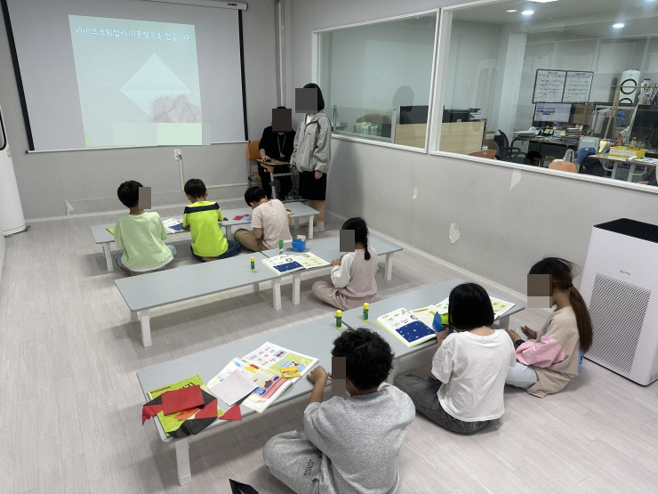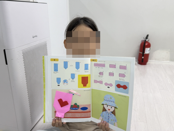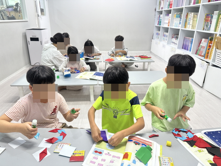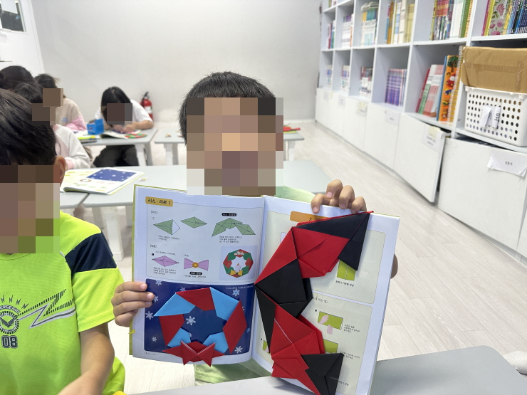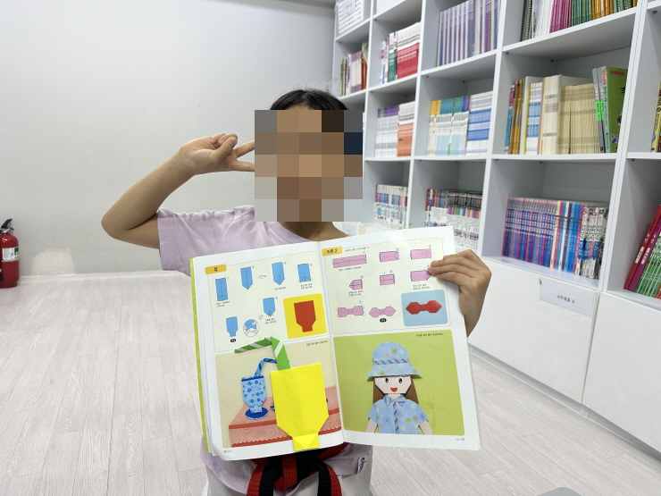 종이접기로 끝내는 것이 아니라 싸인펜으로 자기이름을 적으며 뿌듯해하는 모습을 보여주었다. 2학년 아이는 하나의 종이접기를 접을때에도 선에 잘 맞추어서 접다보니 오래걸렸지만 오래걸린만큼 정말 깔끔한 종이접기로 완성을 하였다. 오래걸려도 선생님의 도움없이 스스로 완성해나가는 모습이 정말 보기좋았다.