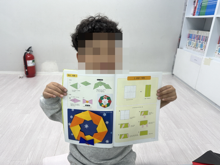 한 아이는 늦게 왔지만 빠르게 리스접기를 시작하여서 금새 따라잡을 수 있었다. 다들 리스, 리본접기를 끝내고 컵접기를 시작하였다. 2학년 아이들이 먼저 시작을 하였는데 영상을 보지않고도 책만 보고 접기 시작하였다. 문접기라는 기초종이접기 지식이 있어야 가능한 종이접기였지만 잘 기억하여서 쉽게 종이접기를 할 수 있었다. 빠르게 컵접기를 끝내고 빨대까지 접어서 장식까지 마무리 해주었다.