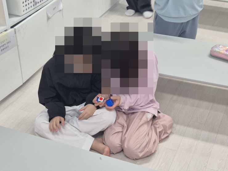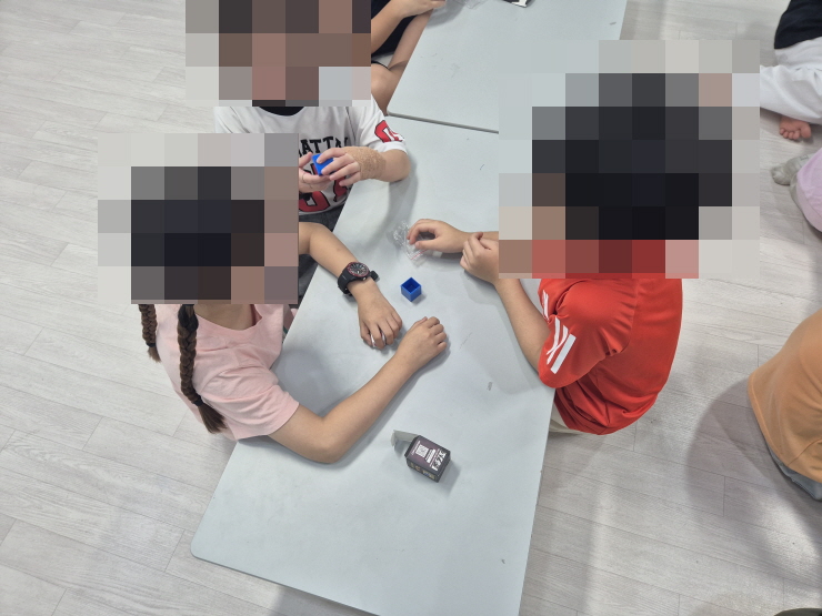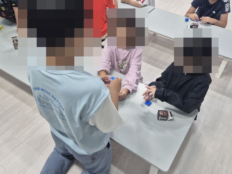 그러고 주간 친구들이 들어와서 각자 앉고 싶은 자리에 앉아 친구들이 선보이는 마술을 보고는 아이들은 보지 않고 어떻게 색을 맞출 수 있는지를 궁금해하면서 배우고 샆다고 이야기 하였다. 2학년 남자아이는 4학년 여자아이 2명과 5학년 남자아이를 알려주었다.
