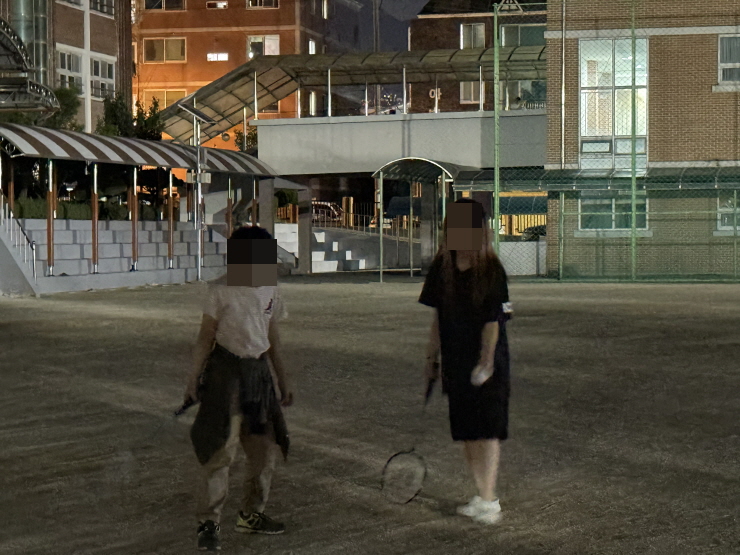 오늘은 야간활동으로 체육 활동을 할 것이라고 아이들에게 이야기 해주니 아이들은 야외에 나가서 활동하는지 묻거나 야외에 나가자고 이야기 하였다. 학교 운동장으로 안전하게 이동을 한 뒤 축구 팀을 짜고 배드민턴 짝을 정하여 활동을 시작했다. 중학교 2학년 여자아이와 중학교 1학년 여자아이는 둘이서 앞으로도 서브를 넣어보고 뒤로 돌아서 서브를 넣어보며 다양한 방법의 서브법을 탐구해 보는 것 같았다.