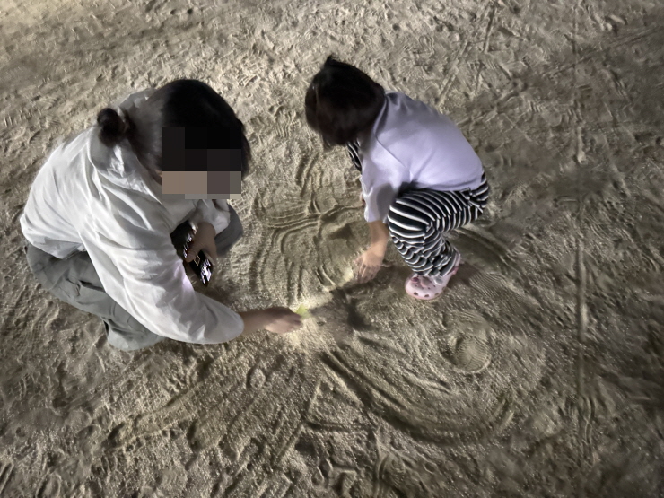 2학년 남자아이와 6학년 여자아이는 선생님 한 분과 세명에서 1:2로 배드민턴 대결을 하였다. 2학년 남자아이는 빛이 없어서 셔틀콕이 안 보이니까 공을 낮게 주지말라며 강한 승부욕 있는 모습을 보여줬다. 3학년 여자아이와 1학년 여자아이는 처음에 열심히 배드민턴을 치다가 3학년 여자아이가 화장실이 마렵다고 하는 탓에 화장실을 가고싶어 하는 아이들을 모아 가까운 화장실을 이용했다. 배드민턴 짝이 없어진 1학년 여자아이는 선생님께 모래놀이가 하고 싶다고 말하여 셔틀콕과 배드민턴 채를 이용하여 모래놀이를 시작하였다. 모래성을 쌓은 뒤 꼭대기에 셔틀콕을 올리거나 모래 안에 배드민턴 채를 숨겨 선생님께 찾아보라는 등 모래를 이용해 많은 활동을 해보였다.