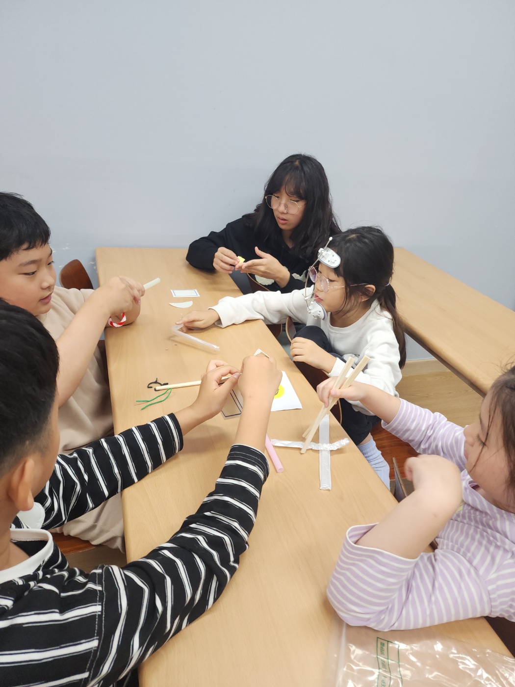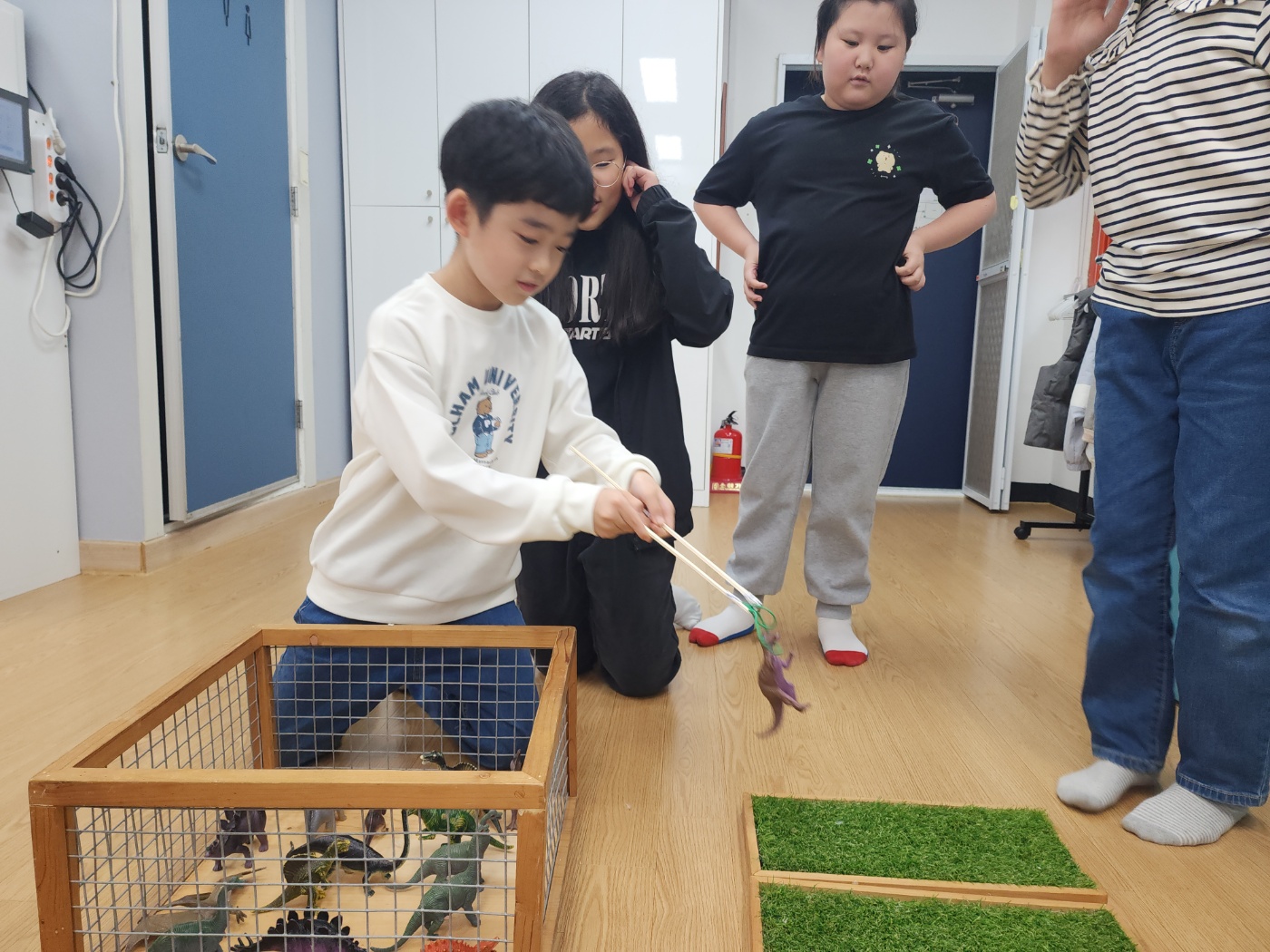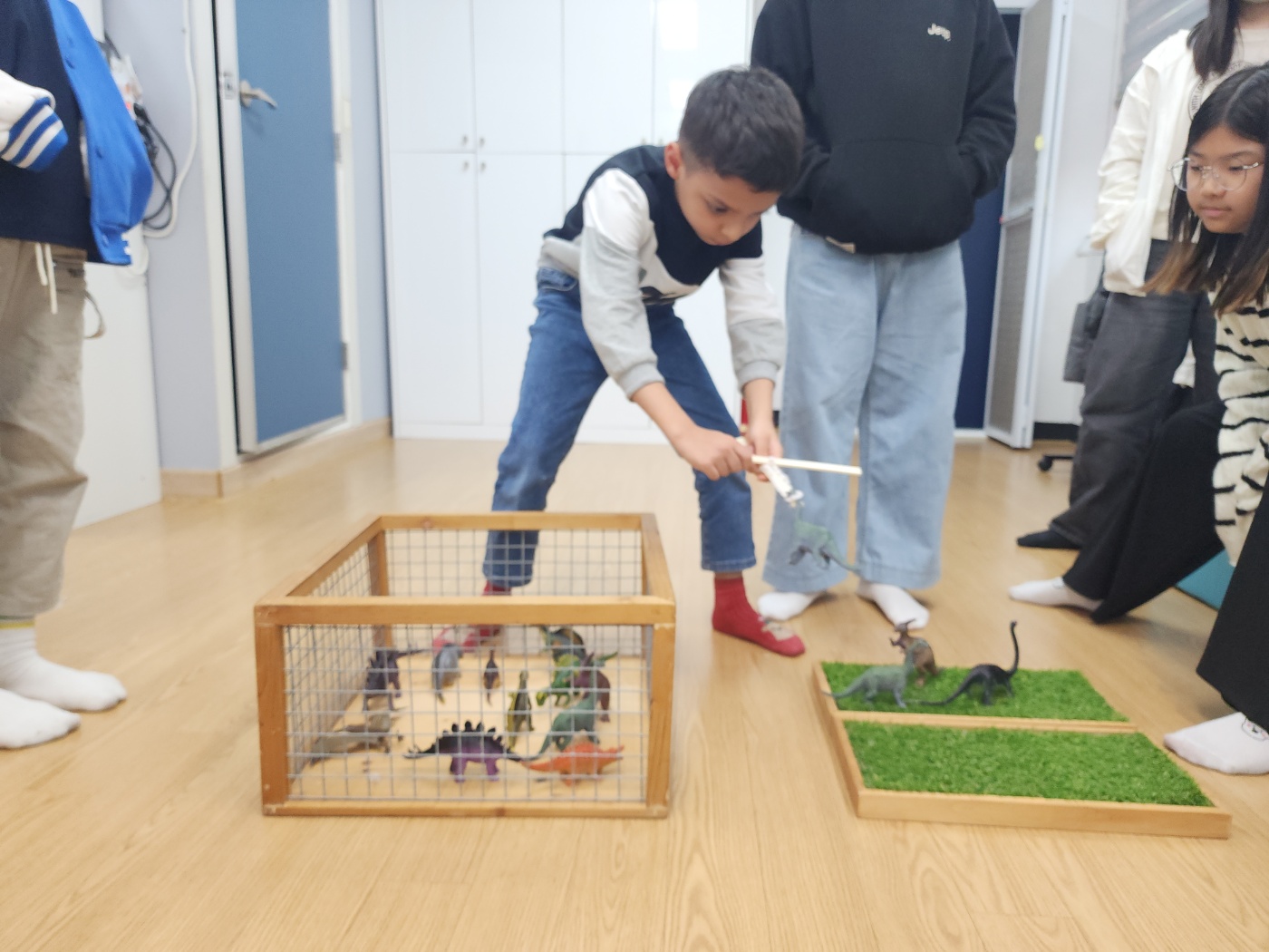 오늘은 나무젓가락과 여러 재료를 이용하여 만든 도구를 활용해서 나무 우리 안에 있는 공룡 모형을 꺼내는 게임을 하였습니다.