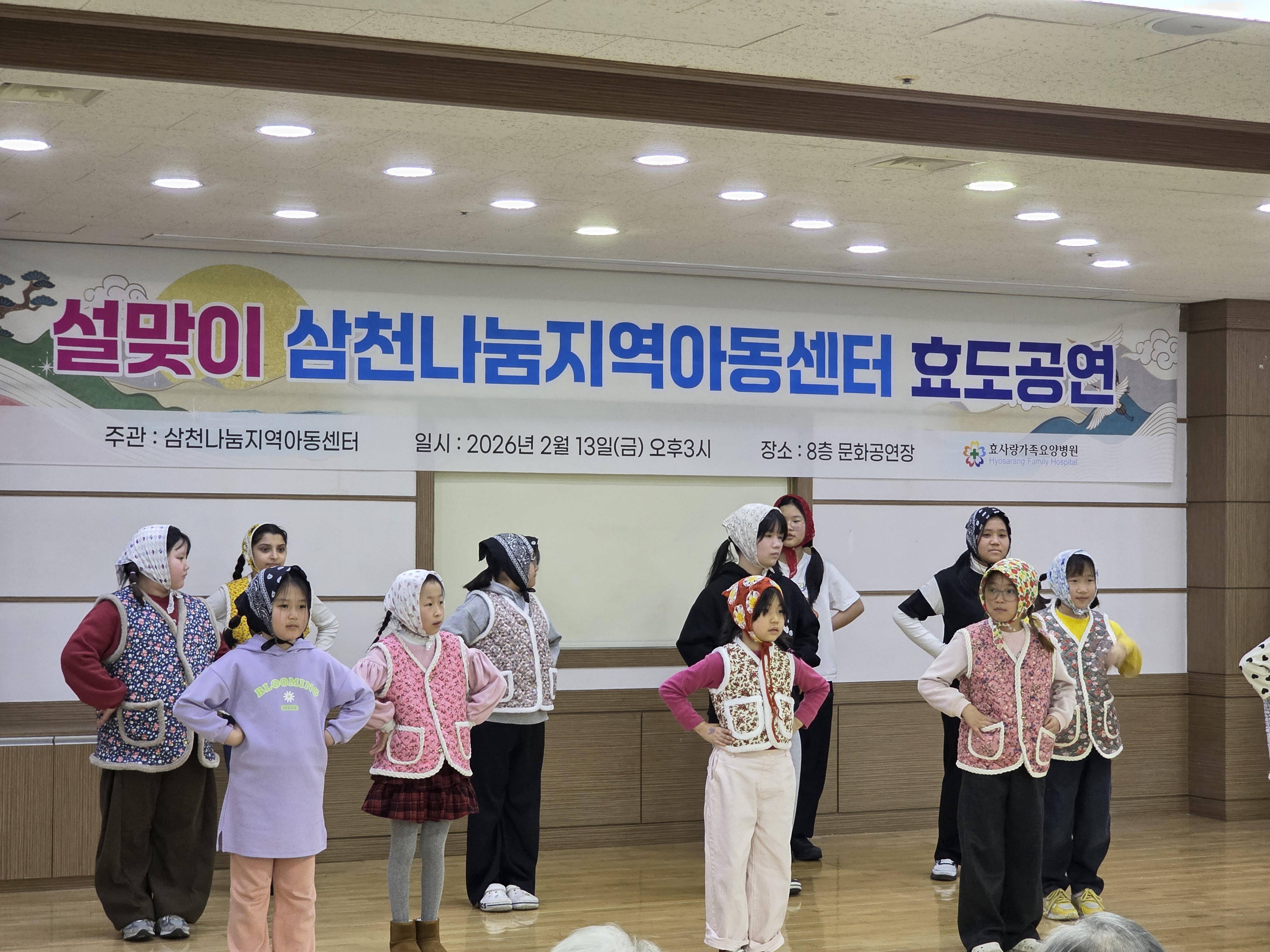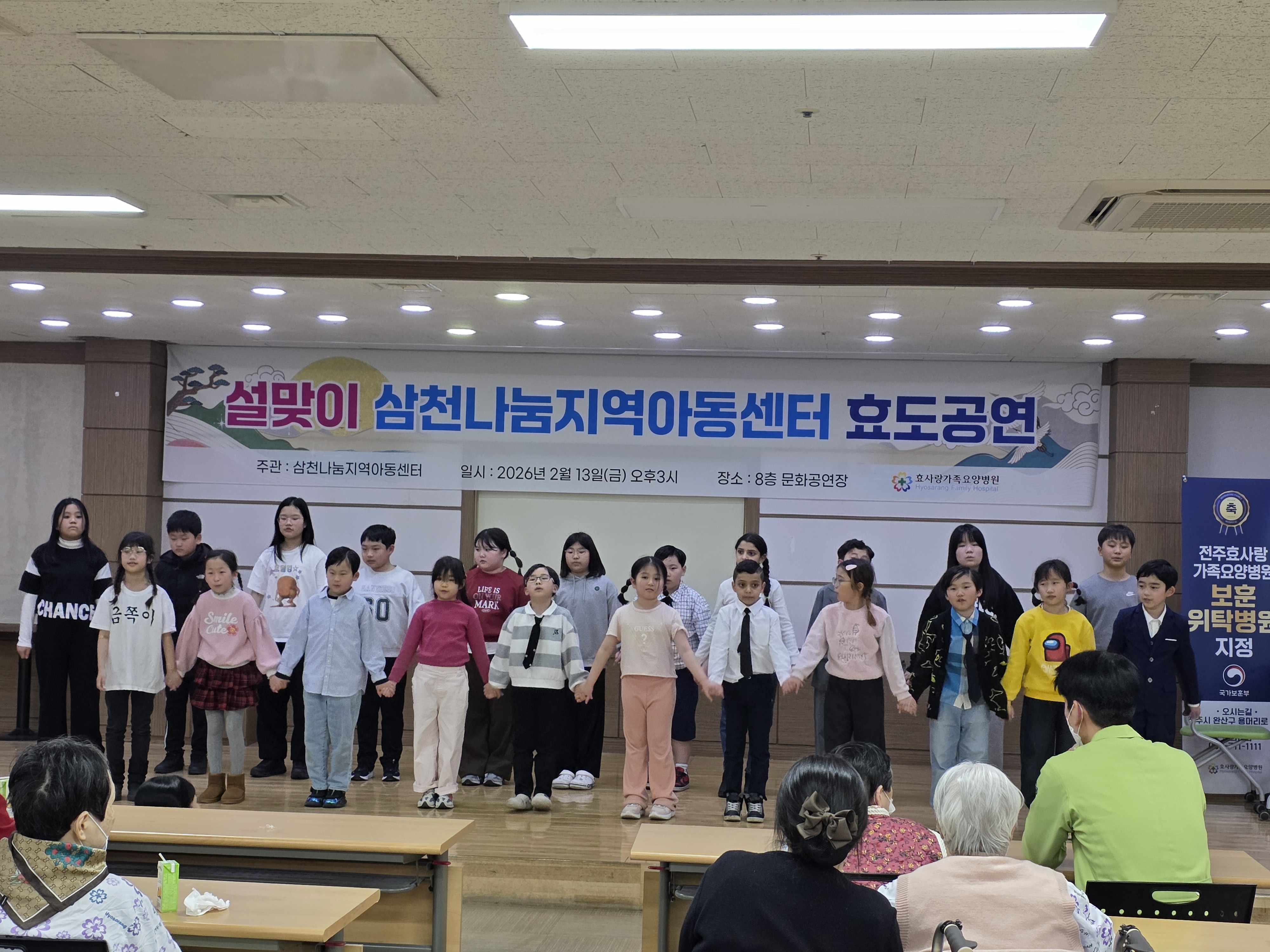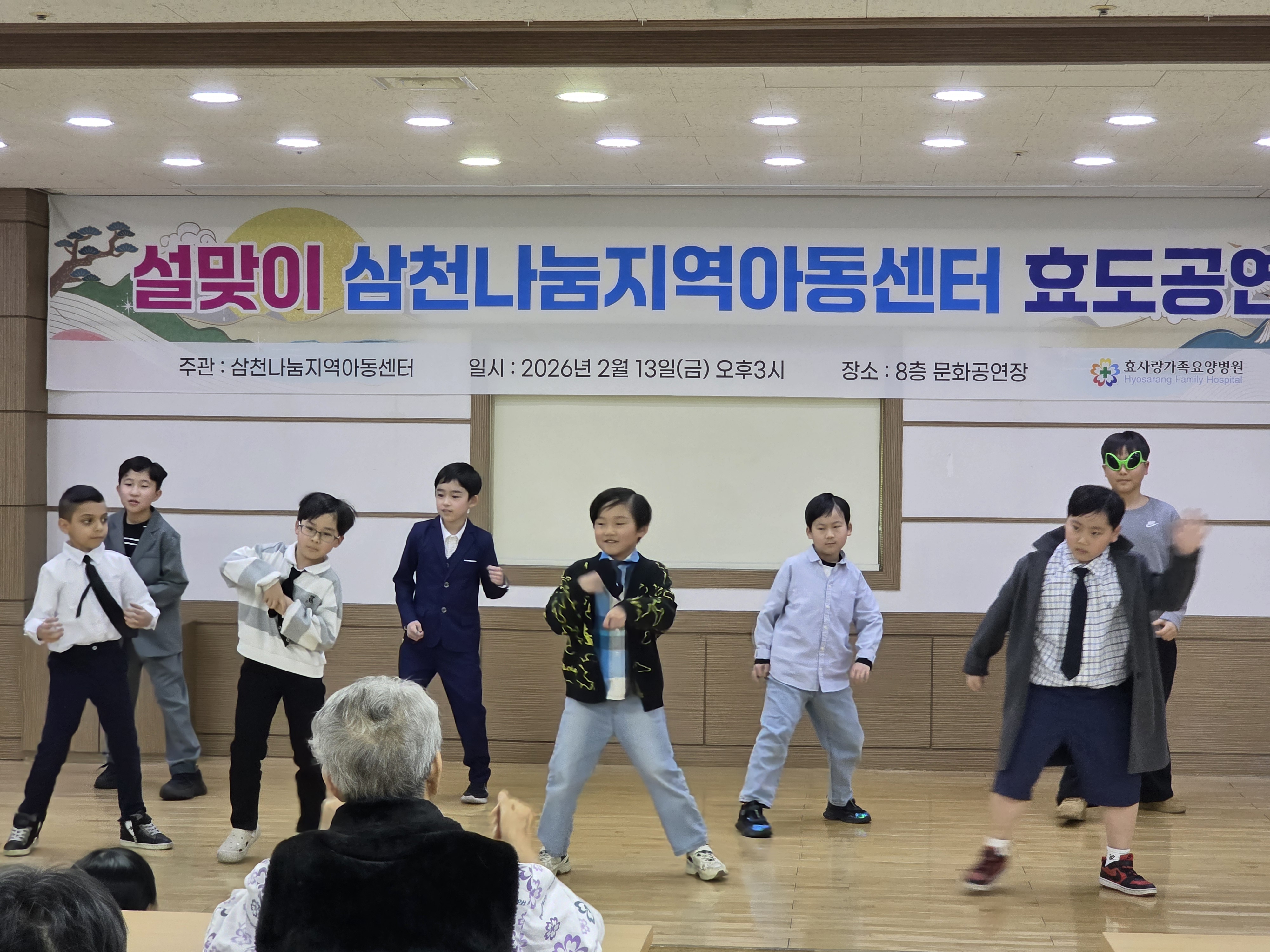 - 일시 : 2026. 2. 13. (금) - 장소 : 효사랑 요양병원 - 내용 : 오늘은 설맞이 효도공연을 진행했습니다. 방학동안 효도공연을 위해 열심히 준비했던 아이들의 공연을 보여드린 시간이었습니다.