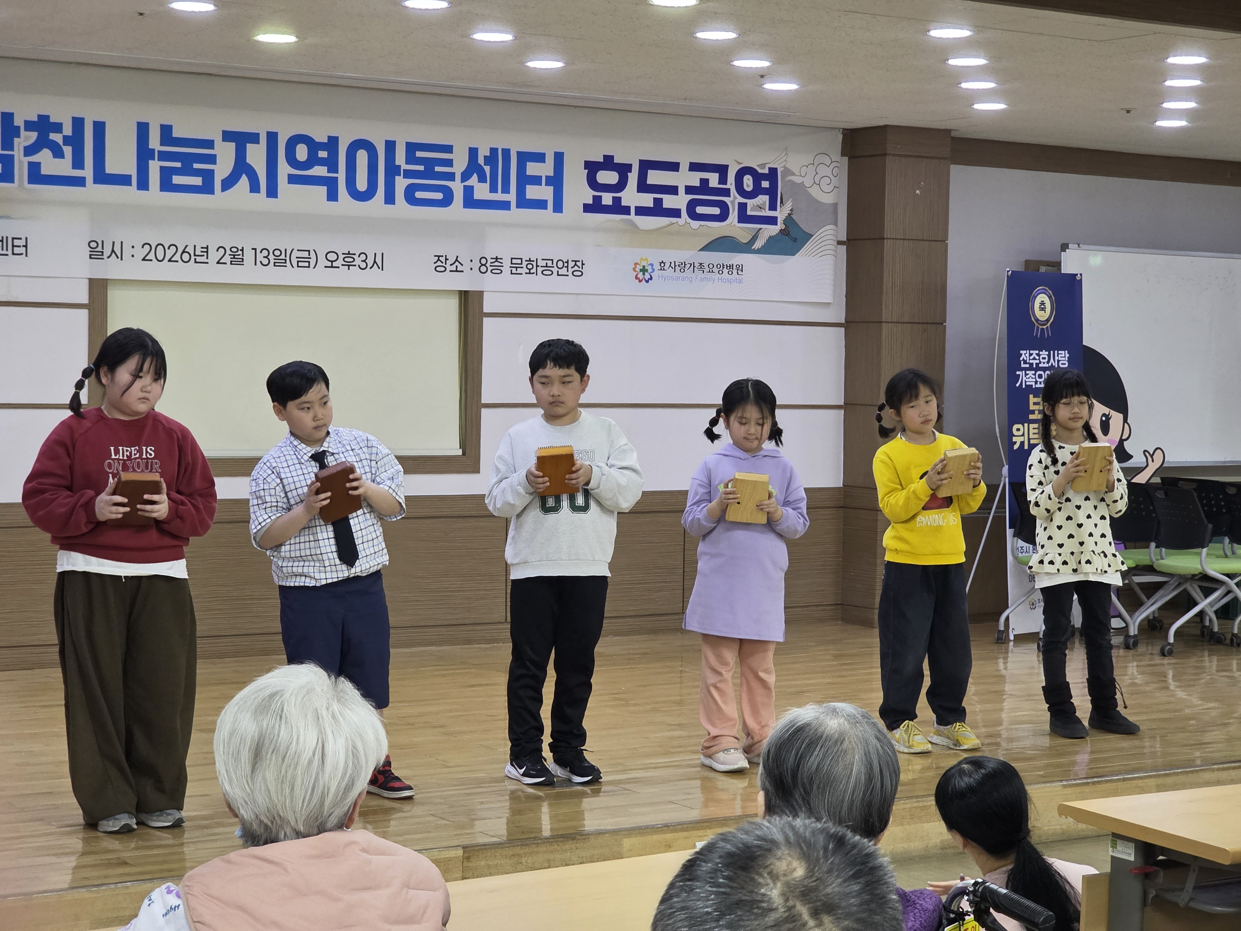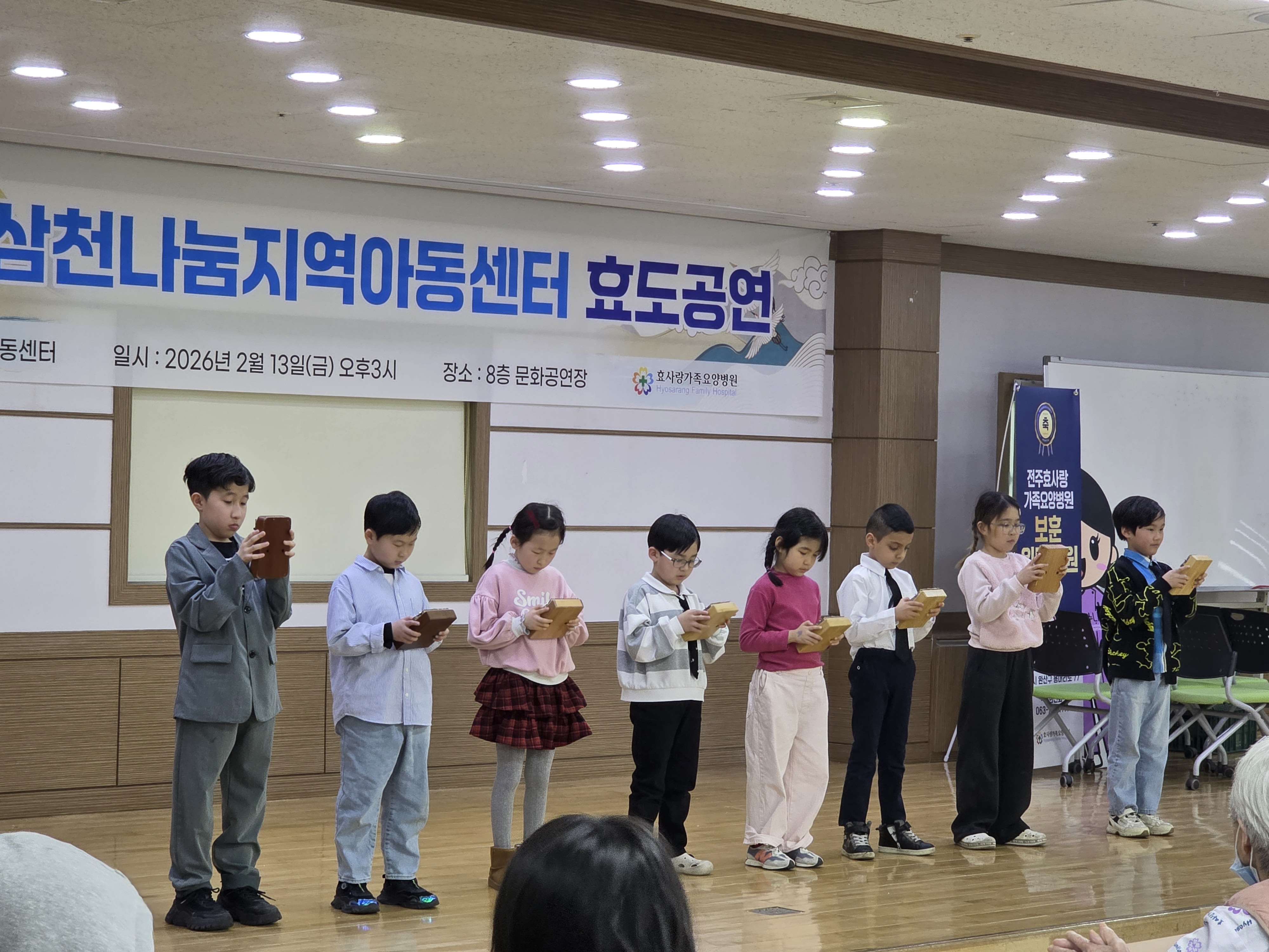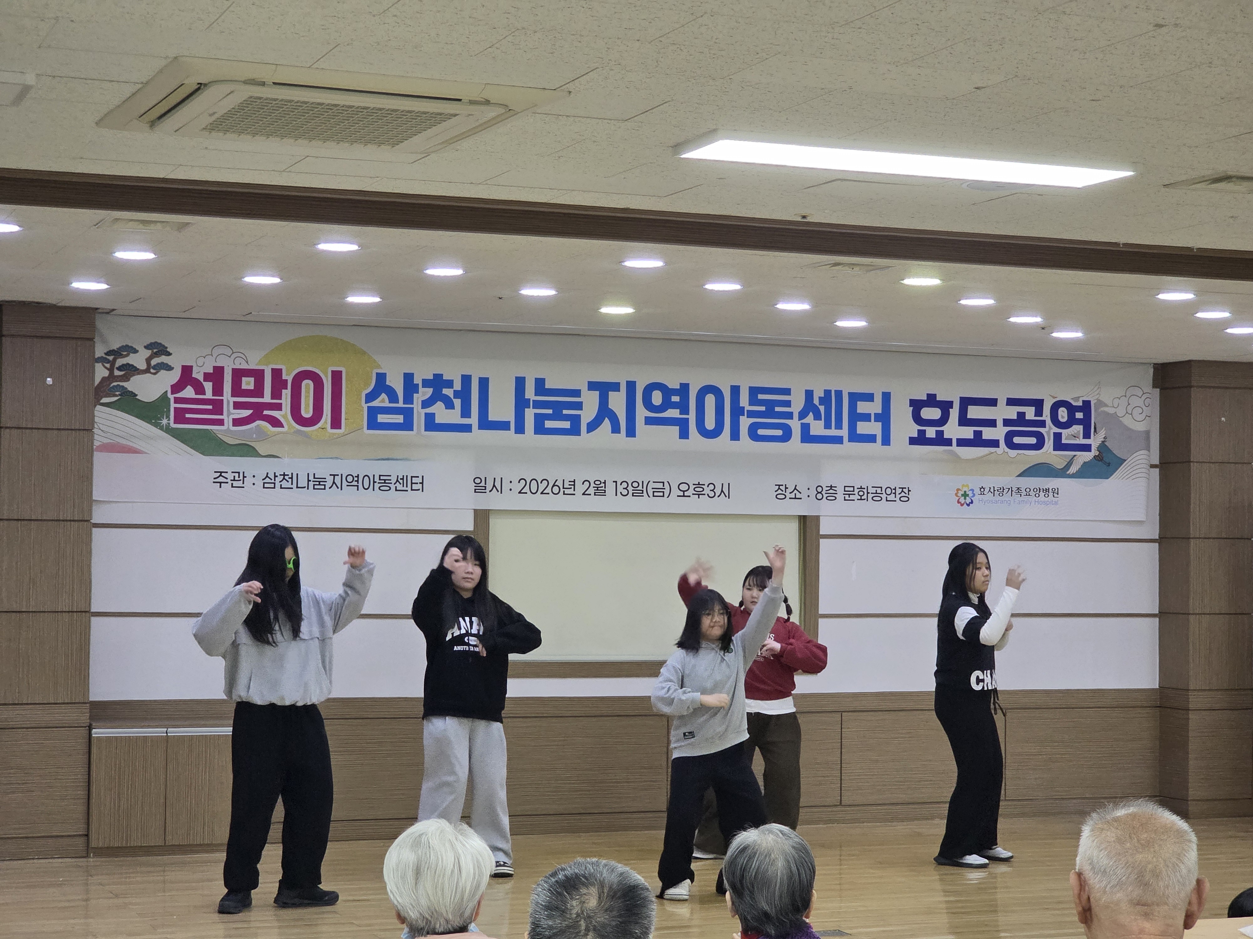 - 일시 : 2026. 2. 13. (금) - 장소 : 효사랑 요양병원 - 내용 : 오늘은 설맞이 효도공연을 진행했습니다. 방학동안 효도공연을 위해 열심히 준비했던 아이들의 공연을 보여드린 시간이었습니다.