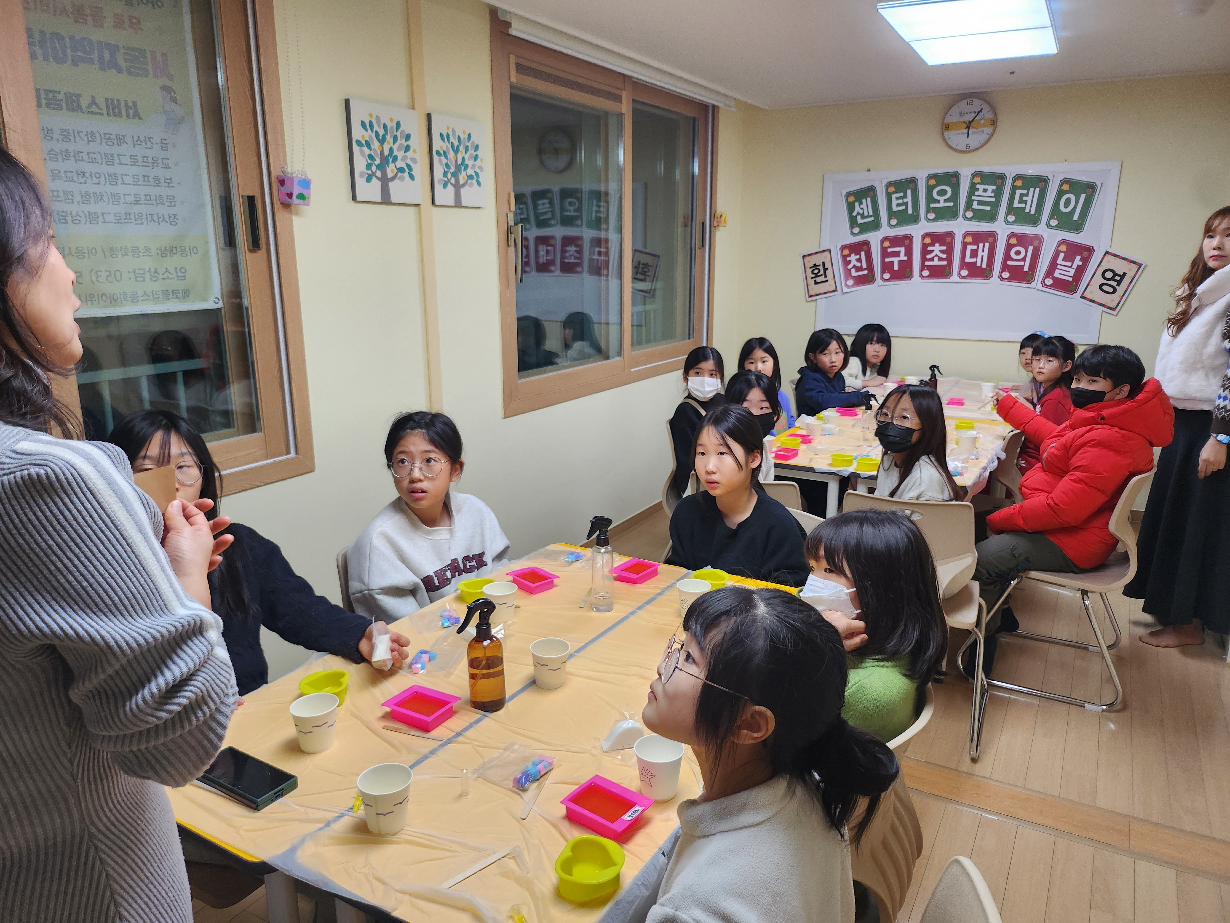 학교앞 홍보물 배부도 하고 센터에 초대된 친구들을 위해 비누공예프로그램과 간식파티도 했답니다.