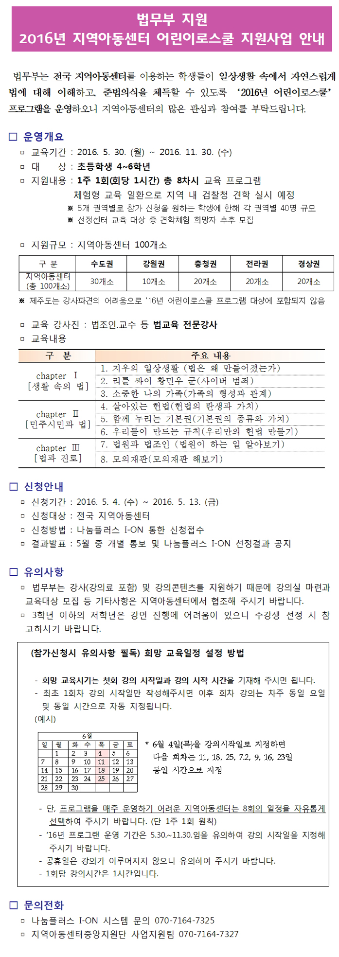 [프로그램] 법무부 '16년 지역아동센터 어린이 로스쿨 지원 신청 안내