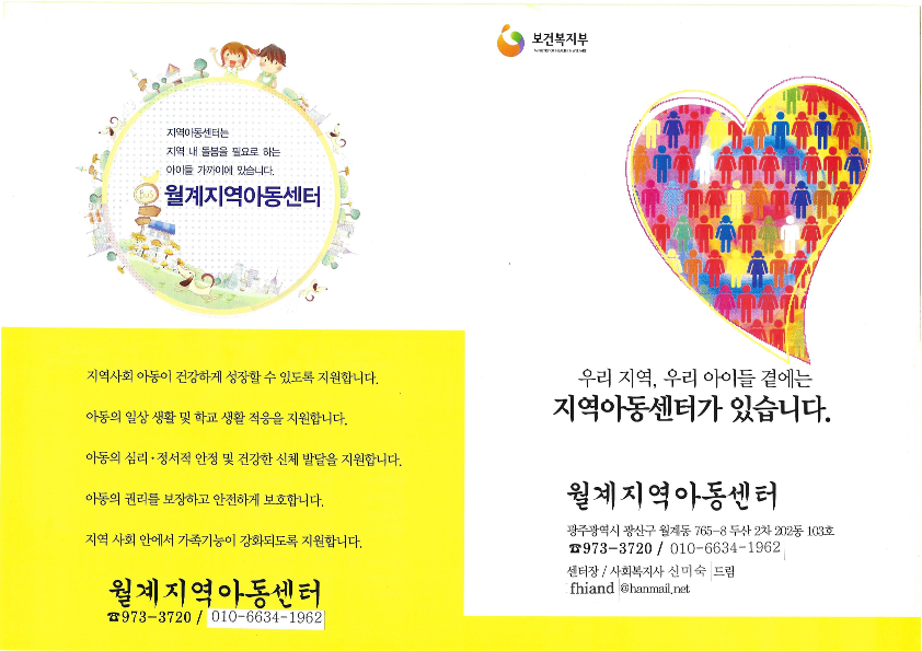 월계지역아동센터 | 광주광역시 광산구 월계로 117-22, 202-103 (월계동, 첨단두산2차 아파트) [지도보기] Tel : 062-973-3720 Fax : 062-973-3720 E-mail : fhiand@hanmail.net