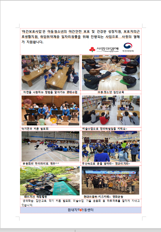 원내지역아동센터 | 대전광역시 유성구 진잠로62번길 49 원내동 [지도보기] Tel : 042-545-0888 Fax : 042-543-9191 E-mail : won153@hanmail.net