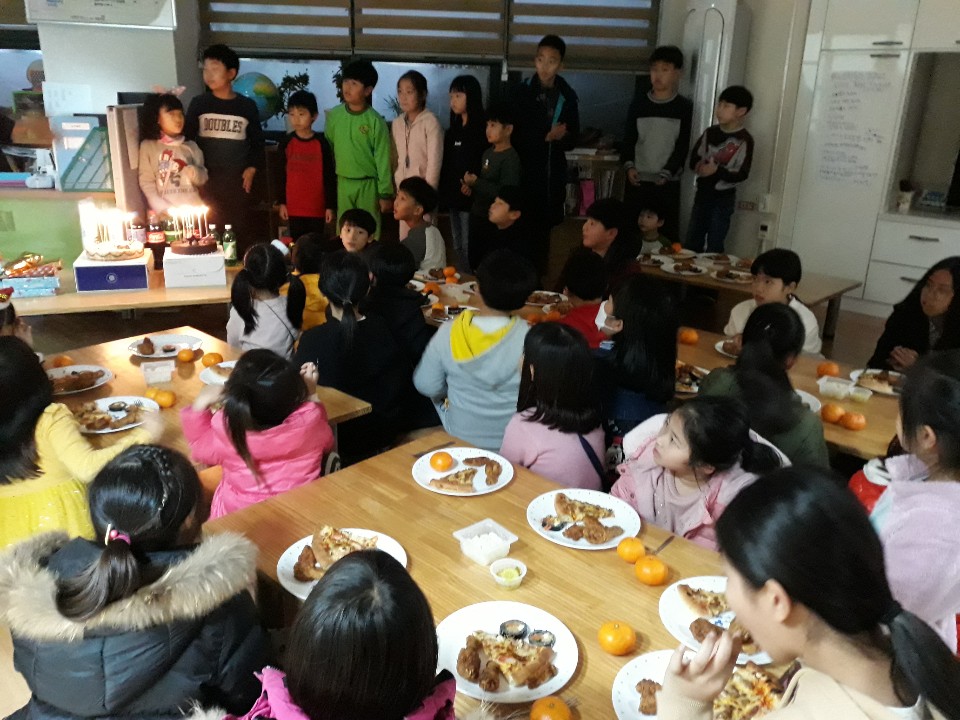 아동들의 선물을 준비하고 맛있는 치킨, 피자, 김밥, 케잌 등 을 먹었어요~