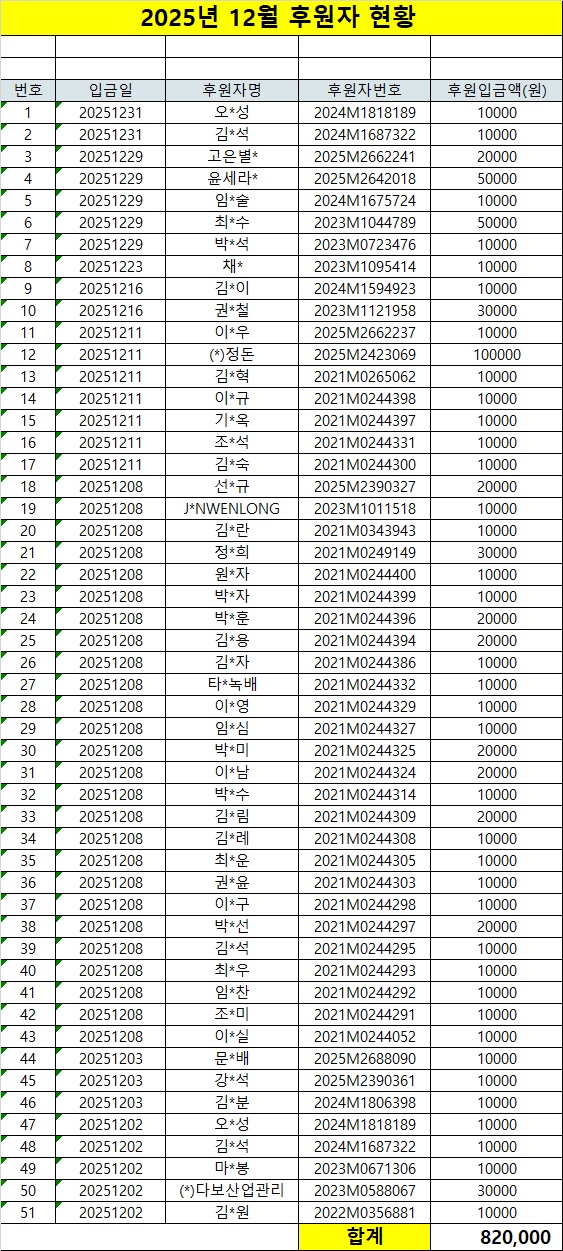 2025년 12월 후원금 입금현황 예사랑지역아동센터에 귀한 후원금을 전달해주셔서 깊이 감사드립니다.. 후원자님의 따뜻한 나눔이 아이들에게 큰 힘과 희망이 되고 있습니다. 보내주신 정성과 마음을 잊지 않고 아이들의 밝은 내일을 위해 소중히 사용하겠습니다. |